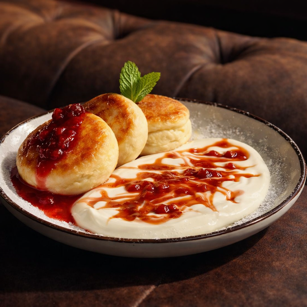 Нежные домашние сырники из натурального творога с золотистой корочкой, поданные со сметаной, ягодным джемом и свежей мятой — настоящее лакомство для идеального завтрака!